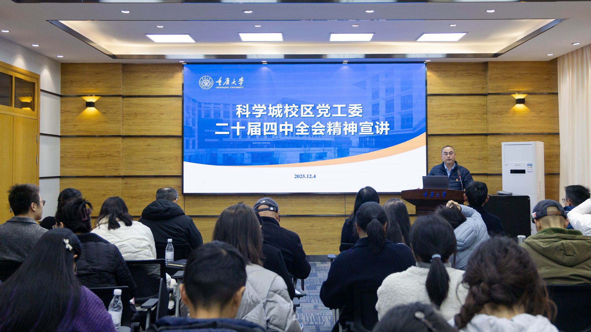 12月4日,科学城校区党工委学习贯彻党的二十届四中全会精神宣讲报告会在虎溪校园综合楼Z228会议室举行。科学城校区党工委书记尹国华作宣讲报告,科学城校区管委会、分析测试中心、超瞬态装置实验室的党员、群众共计百余人参会。会议由科学城校区管委会主任华建民主持。