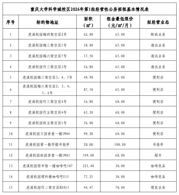 根据教育部关于国有资产房屋出租相关规定,学校本着公开、公平、公正、诚信的原则,现就重庆大学科学城校区2026年第1批经营性公房进行公开招租,欢迎符合条件的竞租人参与竞租。